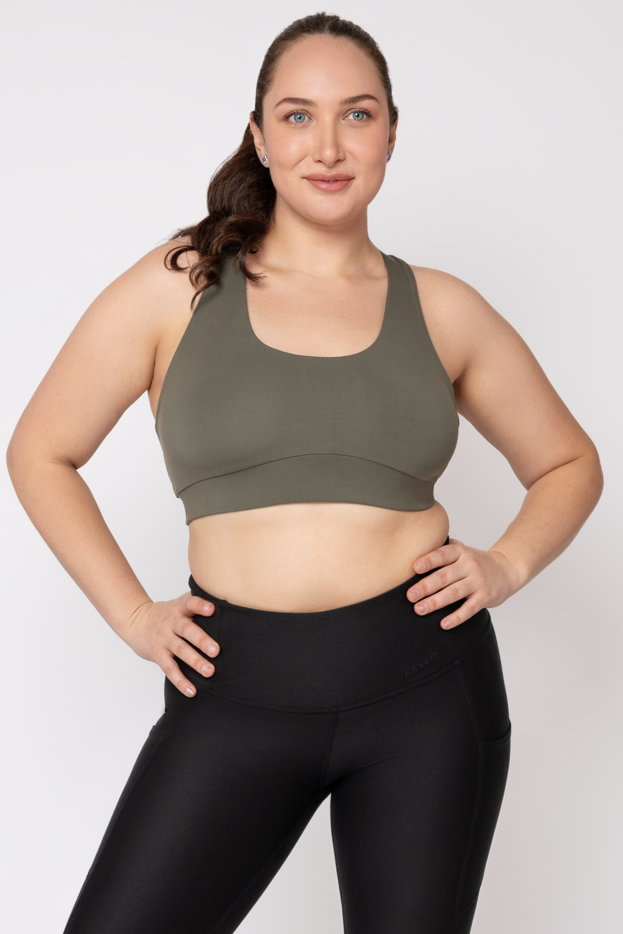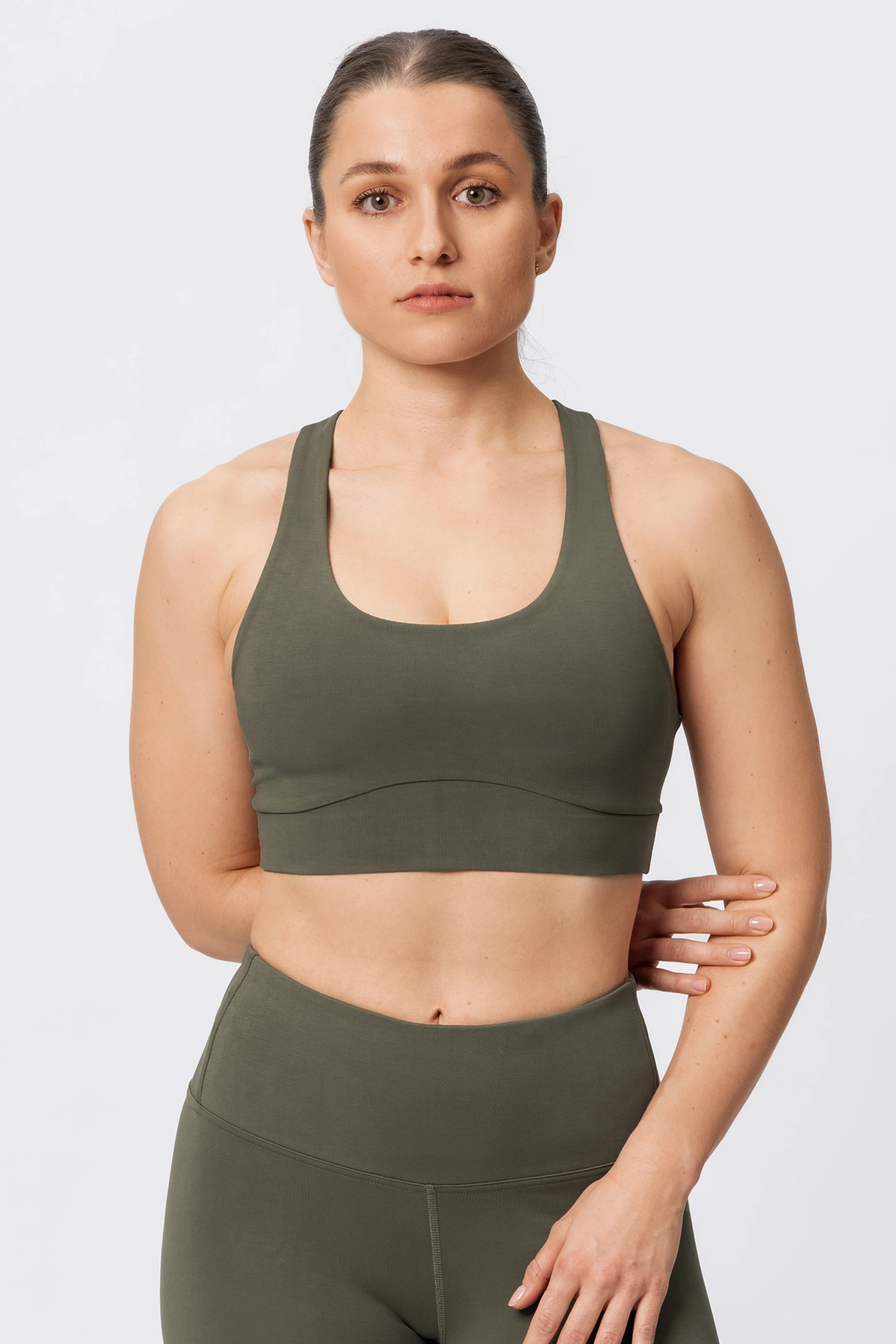 Model wears size S in the khaki bra for a more compressive fit